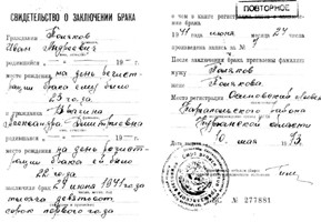 Из письма Корчагина Ю.И.: «..у меня нет слов, я не знаю, как выразить Вам, вашему поисковому отряду «Югра», и лично Владиславу Строеву свою благодарность за ваш труд, за ваше благородное дело. Невозможно удержать слезы, читая ваше письмо, смотря диск, фотографии, и особенно прикасаясь к медальону, который был на груди погибшего. К сожалению, у нас сохранилось только свидетельство о браке Полякова И.А. и моей тети Александры Дмитриевны, высылаю Вам копию. Они поженились 24 июня 1941 года…Умерла Александра Дмитриевна в 2004 году и покоится в селе Осиновское Каргапольского района Курганской области. Когда на диске я увидел перезахоронение, то вспомнил, что я видел это по ЦТ в прошлом году. Там присутствовал известный поэт и композитор Михаил Ножкин, потому что у него воевал подо Ржевом отец. В середине 80-х годов он написал песню о битве под Ржевом, где есть такие великие слова: